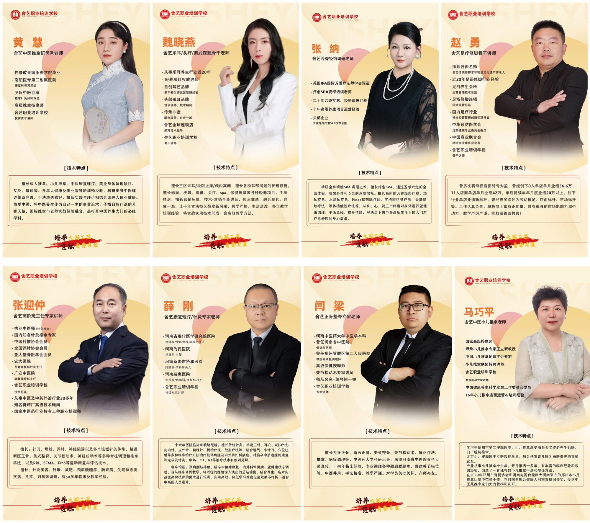 舍艺学校培训技术:中医成人推拿按摩、正骨整脊、中医针灸、足疗修脚、采耳耳疗、瑶药头疗、运动康复、经络调理、肌骨疼痛徒手疗法、泰式踩翘、大刀修面、小儿推拿、神经松动、艾灸专题、产后康复、膏药熬制等等